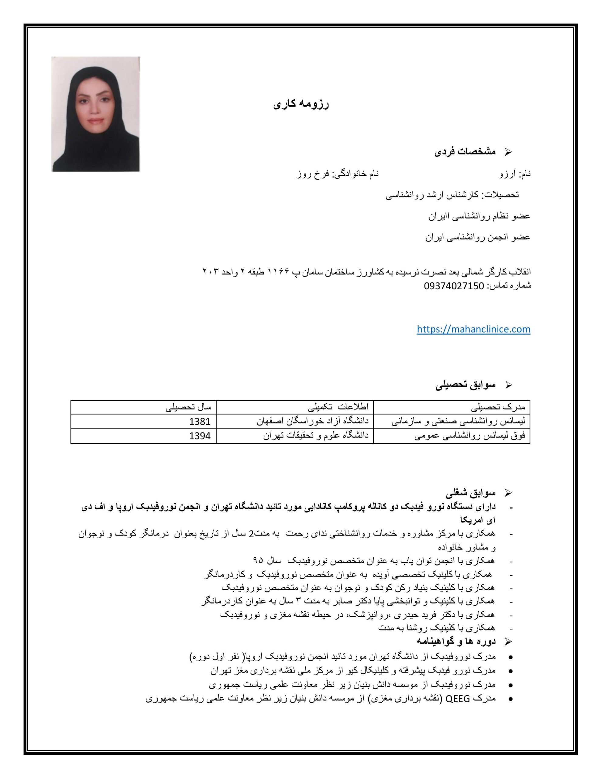 تجربۀ عملی، الماس دانش تئوری را صیقل میدهد. رزومۀ خانم فرع روز از سابقهای درخشان و متنوع در همکاری با مراکز معتبر درمانی حکایت دارد. ایشان تجربۀ همکاری با مراکزی همچون: